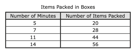 A worker is packing items in boxes. The table shows the linear relationship between the number of items the worker has packed in boxes after different amounts of time.