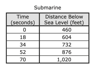 The table shows the linear relationship between the distance in feet below sea level and the time in seconds traveled by a submarine.