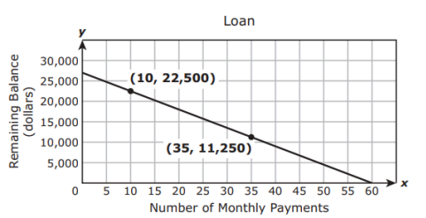 The graph models the linear relationship between the number of monthly payments made on a loan and the remaining balance in dollars left to pay on the loan.