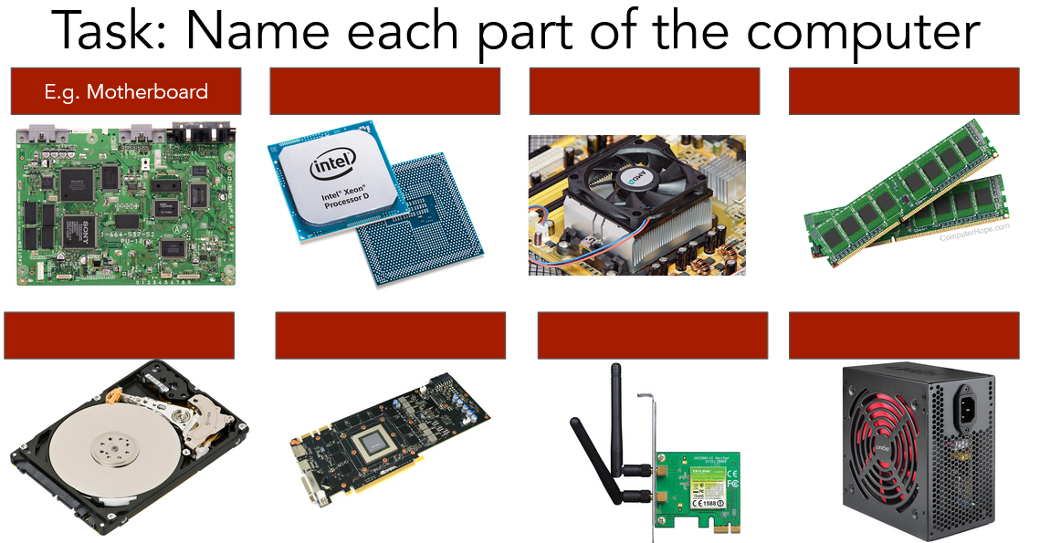 Example: Hardware name: MotherboardWhat does it do: The backbone of the computer - connects parts together.