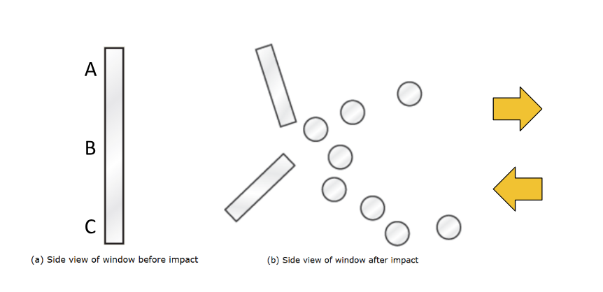 Examine the diagrams, which show a side view of a window before and after impact. Determine the point of impact and direction of force.