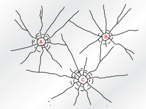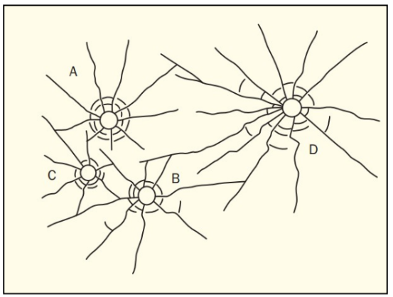 Refer to the following diagram of the glass fracture patterns produced by three different impacts. Which occurred first, second, and third? Be prepared to justify your answer.