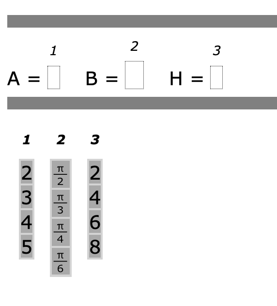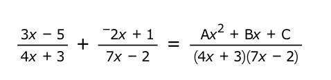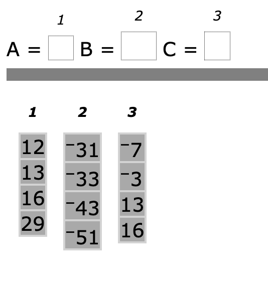 Place (click and drag) into the appropriate boxes the values of A, B, and C that will make the equation shown below true.