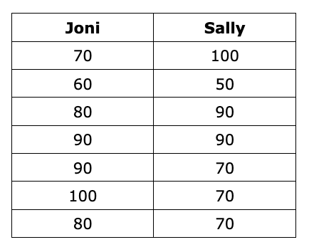 The scores that Joni and Sally received on their first seven assignments are shown in this table.
