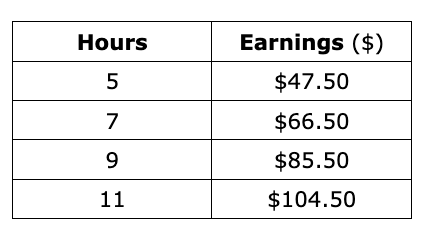 Susan’s weekly earnings were proportional to the number of hours she worked. This table shows the number of hours Susan worked and the amount she earned.