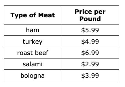 A customer purchased \frac{1}{4} pound of ham, 1\frac{1}{2} pounds of turkey, 1 pound of roast beef, and \frac{3}{4} pound of bologna. Approximatelywhat will the customer pay for the purchase before sales tax?