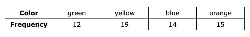 Paul has a spinner with 4 colors: green, yellow, blue, and orange. He spins the spinner 60 times and records each color it stops on. The results are shown in this table.