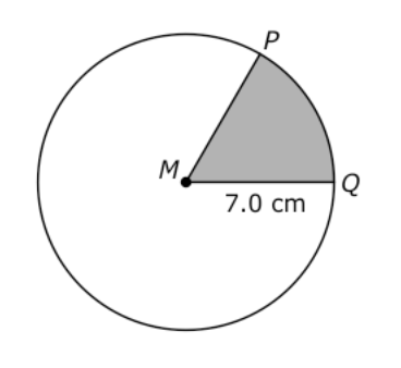 Circle M has a radius of 7.0 \, \text{cm}. The shortest distance between P and Q on the circle is 7.3 \, \text{cm}.