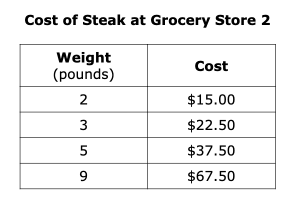 The equation y = 6.75x models the cost, in dollars, to purchase x pounds of steak at grocery store 1. This table shows the cost to buy different weights of steak at grocery store 2.