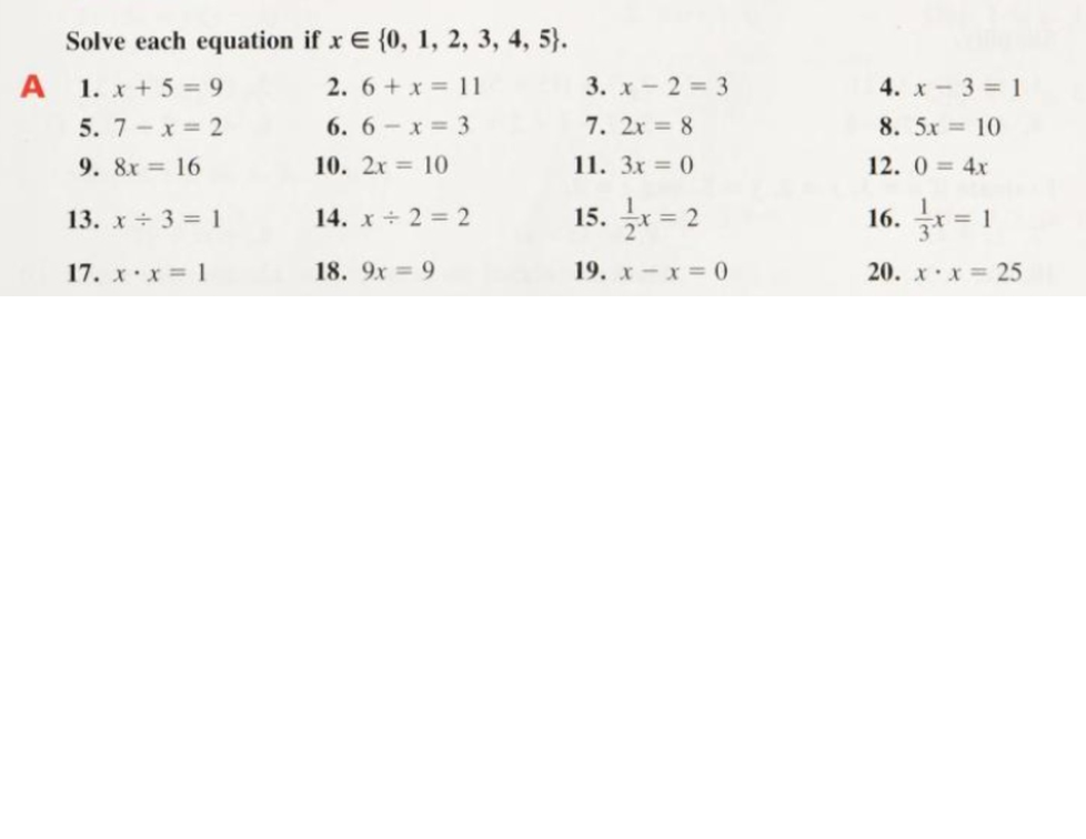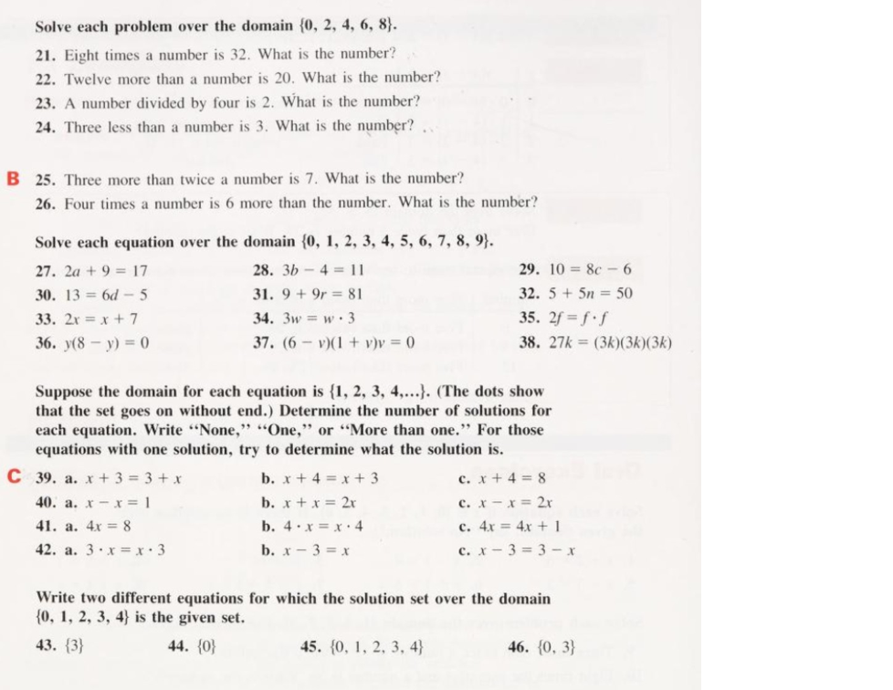 Suppose the domain for each equation is {1, 2, 3, 4,...}. (The dots show that the set goes on without end.) Determine the number of solutions for each equation. Write “None,” “One,” or “More than one.” For those equations with one solution, try to determine what the solution is.