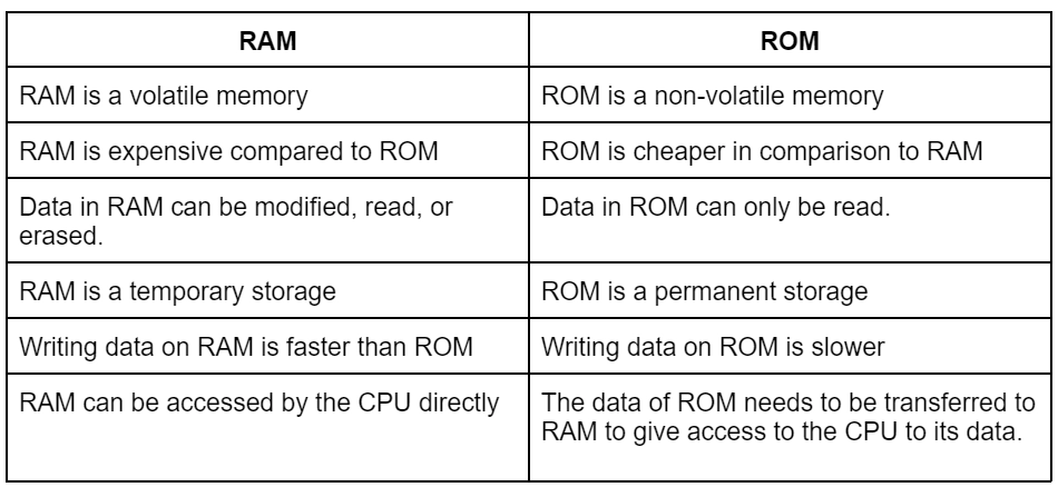 Read Only Memory (ROM) is read only, and used to boot the computer on. It’s data is not lost when the power is turned off (this is called non-volatile).