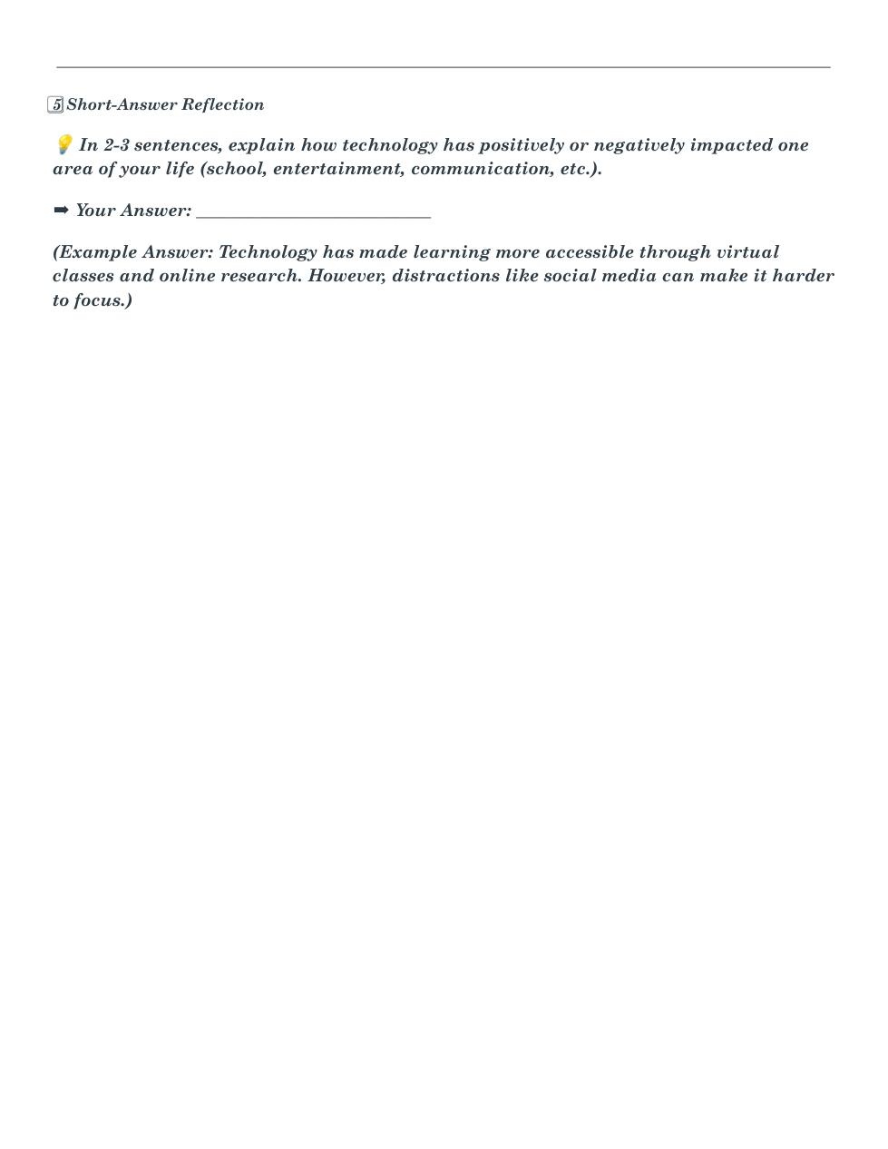 💡 In 2-3 sentences, explain how technology has positively or negatively impacted one area of your life (school, entertainment, communication, etc.).