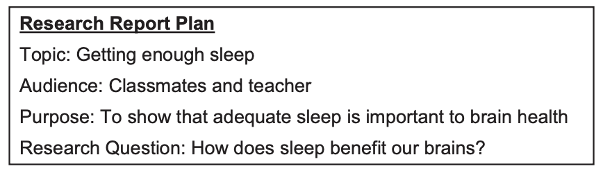 A student is writing a research report about sleep. Read the student’s research report plan.