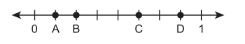 Which point represents a fraction equivalent to \frac{1}{4}?