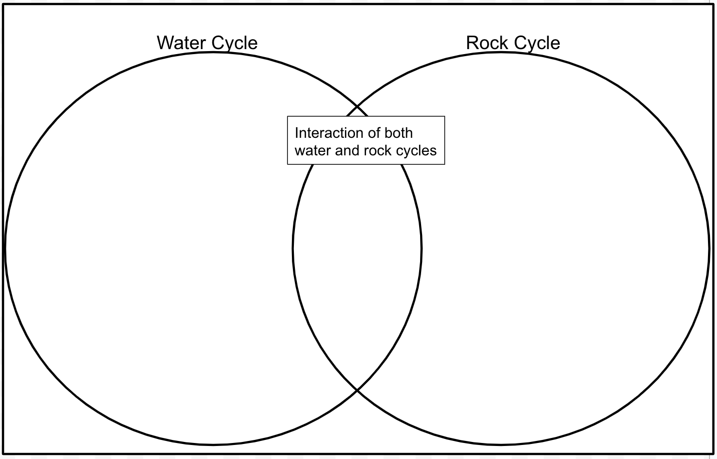 How do the rock and water cycles interact? Drag and drop the appropriate items into the venn diagram to show that it applies to the interaction of both water and rock cycle, only the water cycle, or only the rock cycle.