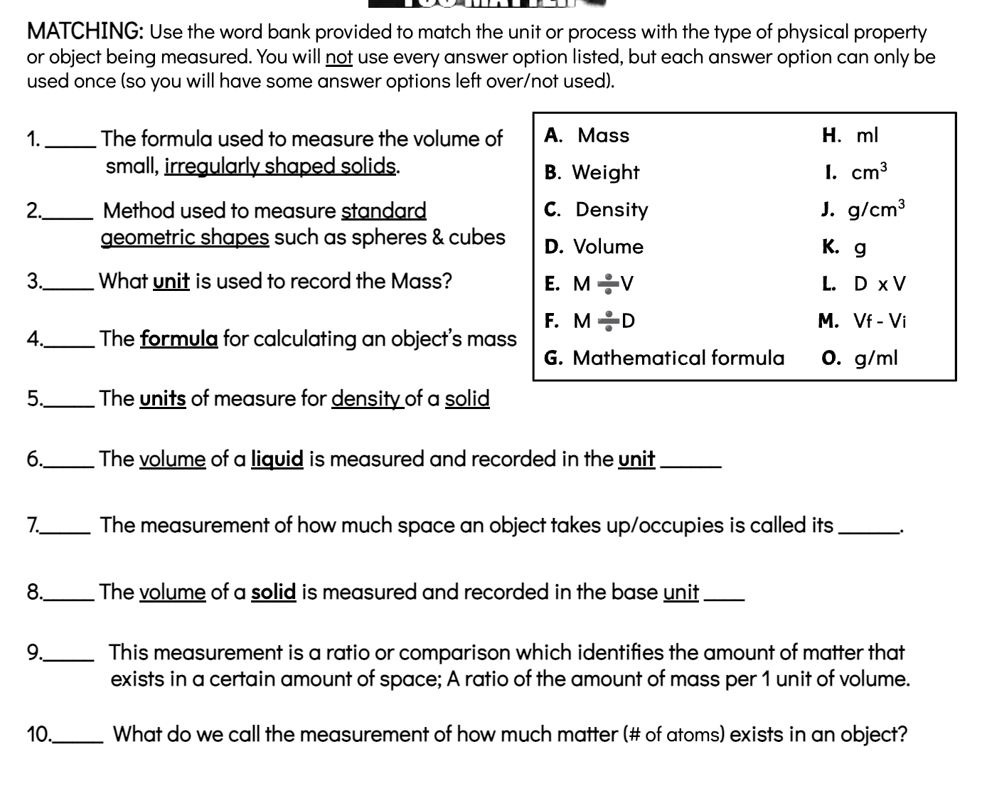 IDENTIFY: Pick two measurements (from the word bank below) to answer the next three questions. You will use some answers twice and some will not be used at all.