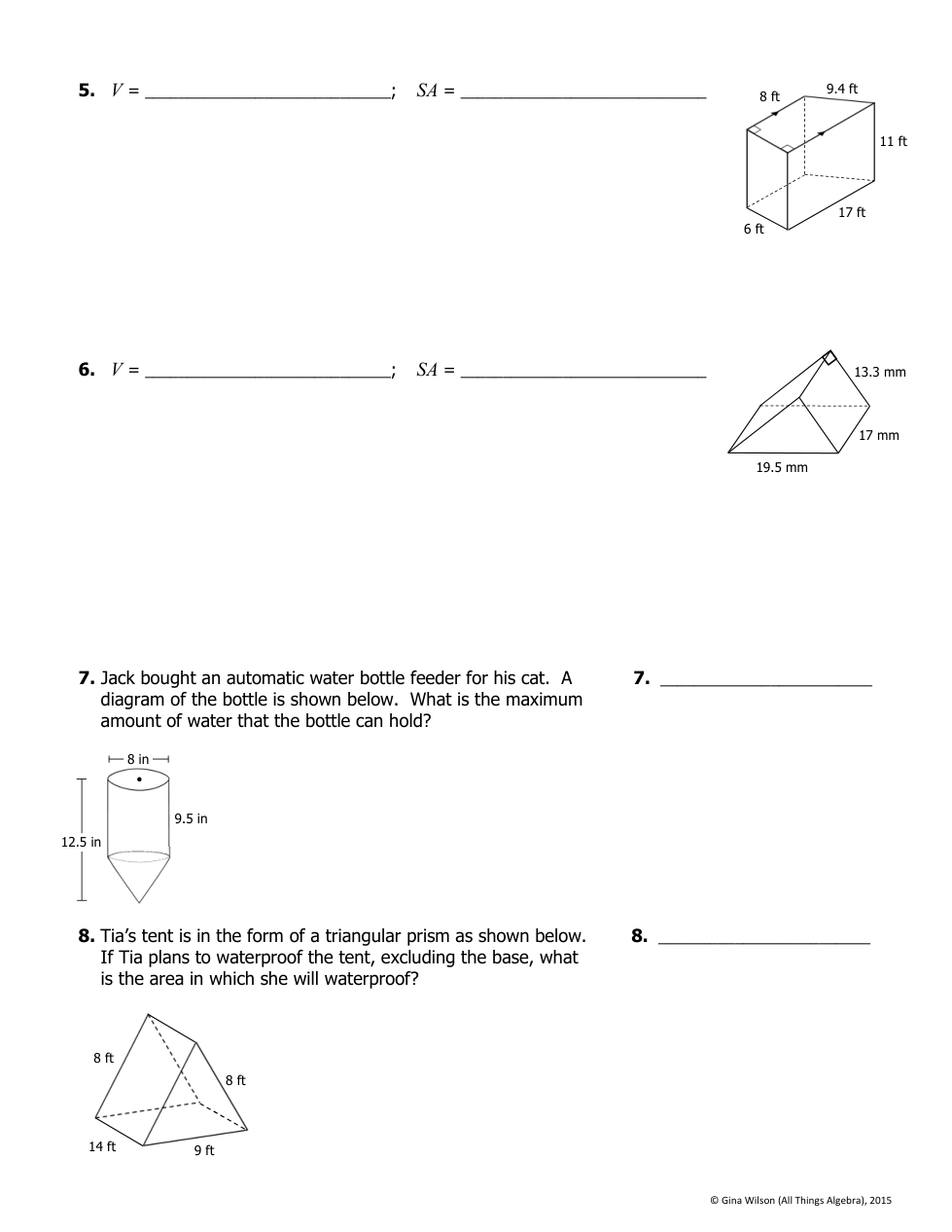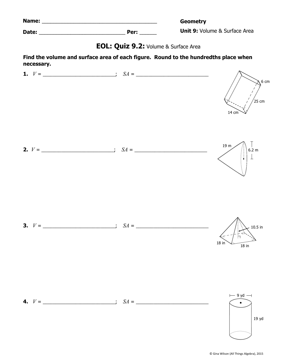 Find the volume and surface area of each figure. Round to the hundredths place when necessary.