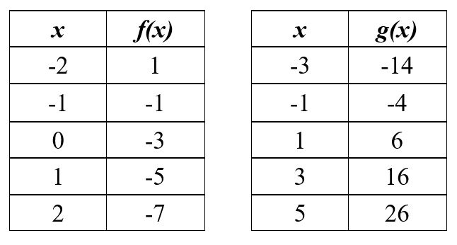 The tables of ordered pairs represent some points on the graphs of linear functions f and g.