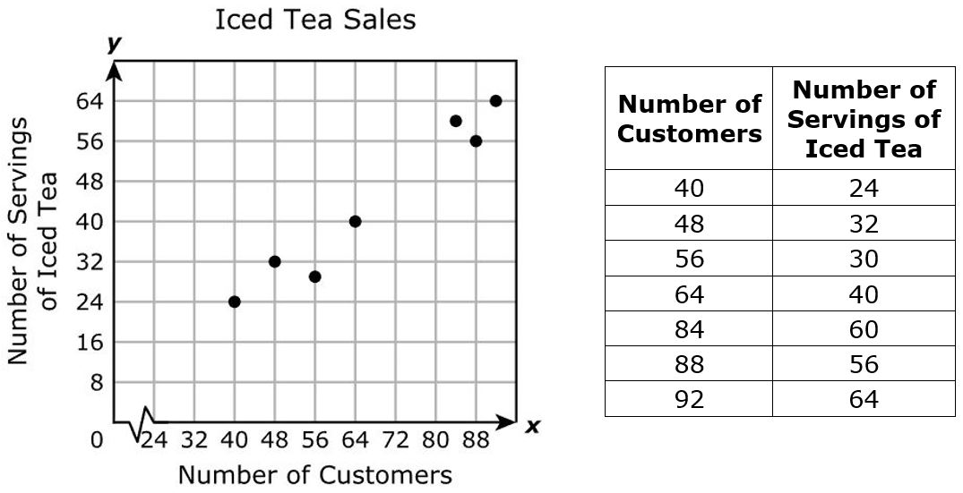 The graph and table show the relationship between the number of customers at a restaurant and the number of servings of iced tea sold.