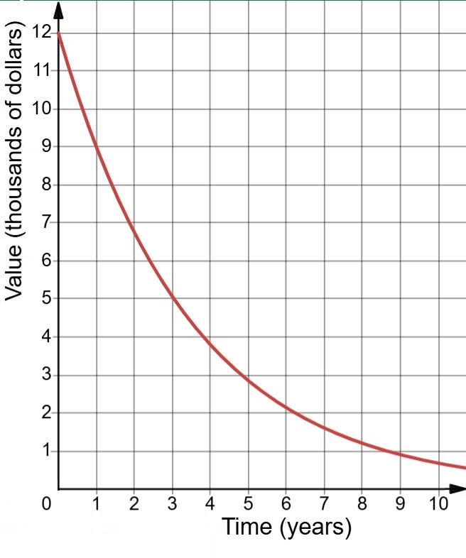 The value of a car depreciates according to the following graph. Let y = V(t) where V is the value of the car after t years.