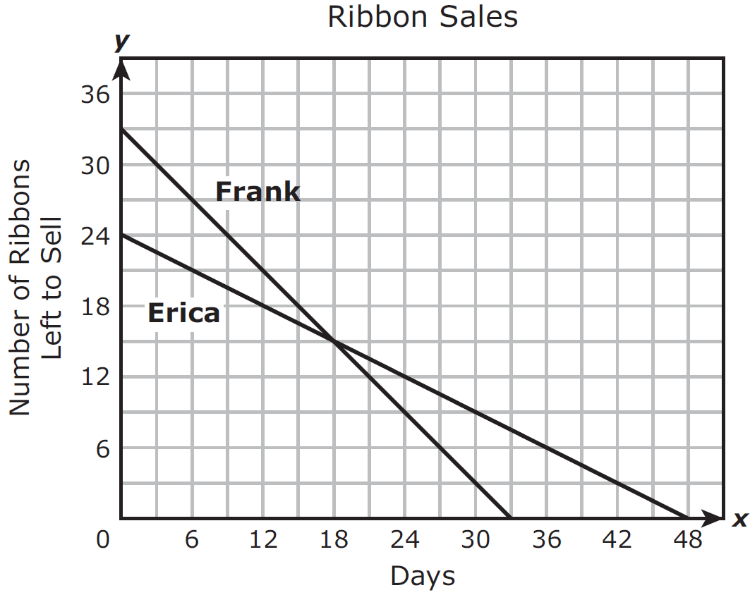 Frank and Erica are selling ribbons to raise money for the football team. The graph shows the linear relationship between the number of ribbons each of them has left to sell and the number of days that they have been selling ribbons.