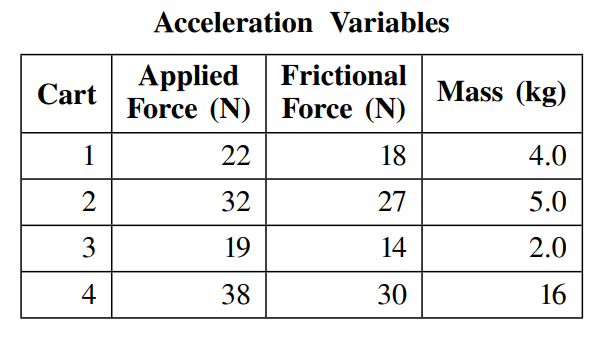 PART A) Based on the data table, which cart has the lowest acceleration?