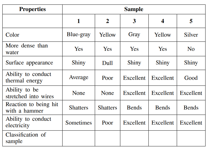 Which SAMPLES are metals? CHOOSE 3 CORRECT ANSWERS