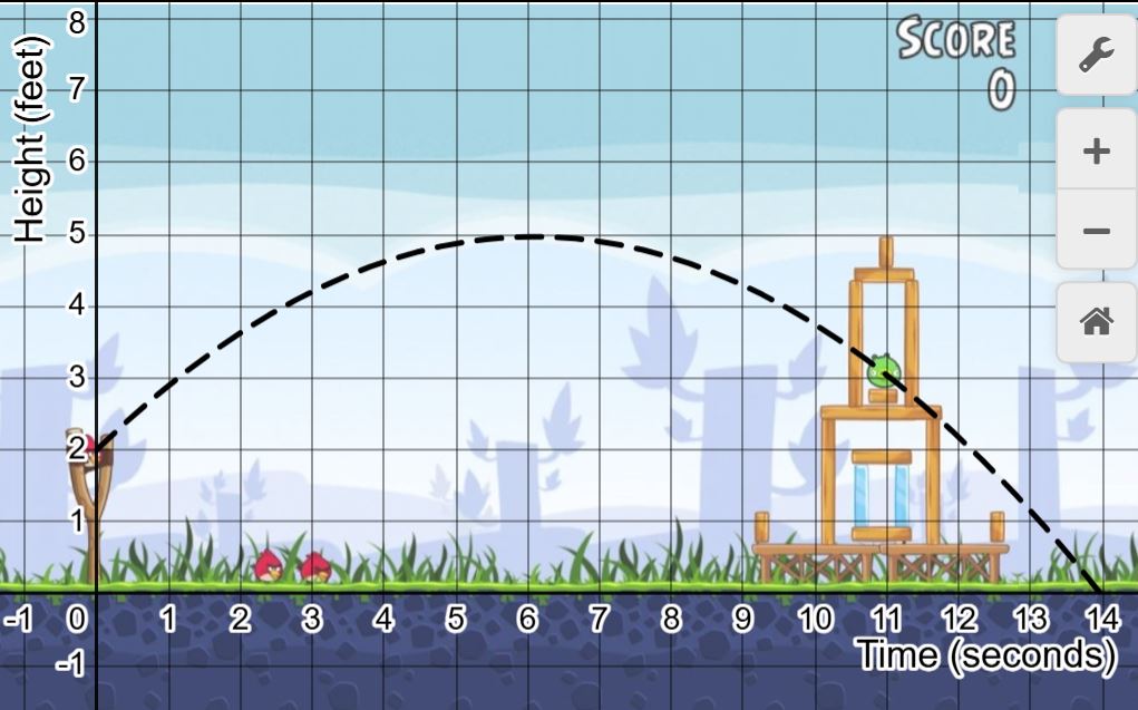 The premise of the game Angry Birds is to shoot the bird from the slingshot and hit the pigs to advance to the next game level. The flight path of the red bird is illustrated in the questions below. Please answer the following questions.