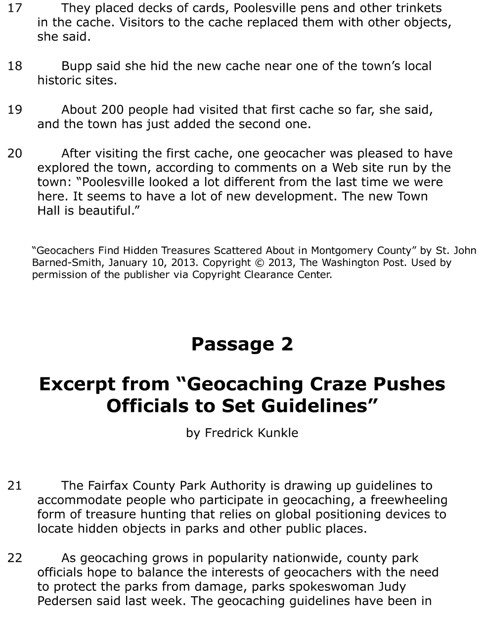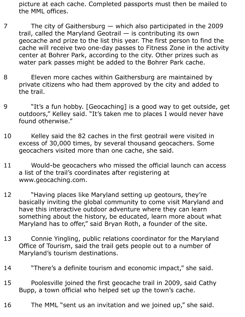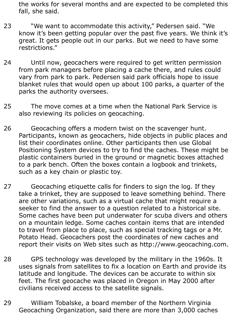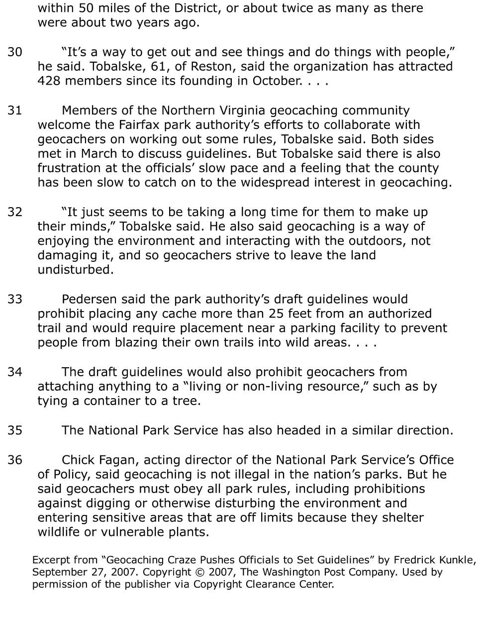 List 2 quotes, one from each passage. The first quote must show a benefit to geocaching. The second must show a drawback to geocaching.