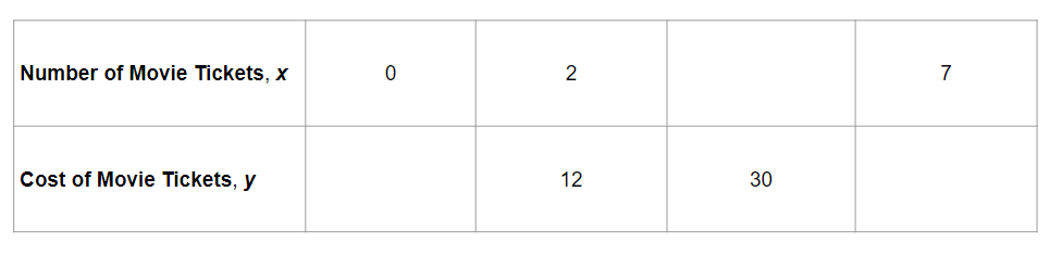 The equation y=6x can be used to determine y, the number of dollars it costs to buy x movies at the student price. Complete the table to show the relationship between x and y.