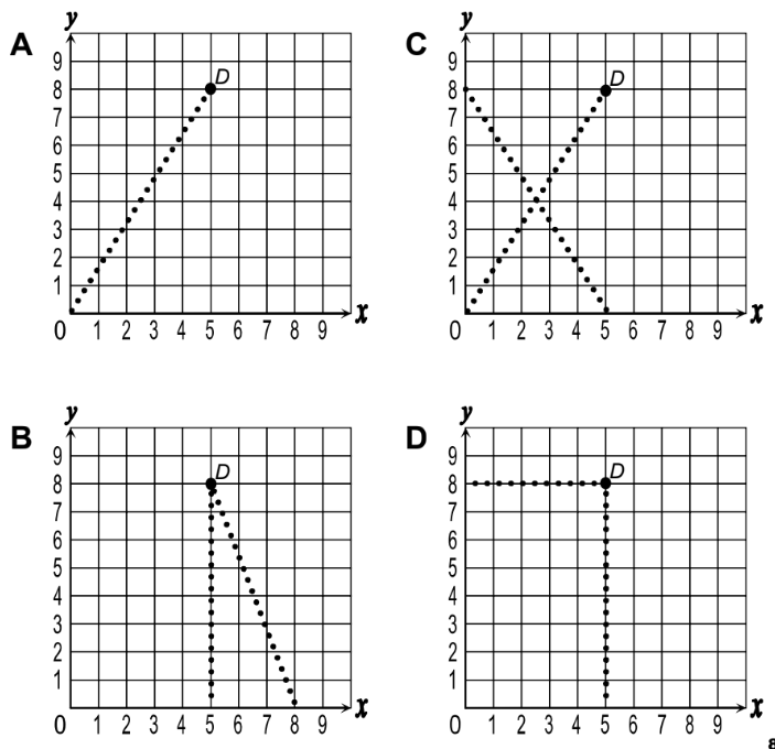 Darika placed point D at (5, 8) on a coordinate plane. Which diagram best represents the steps Darika likely followed?