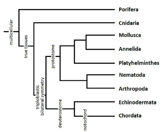 To determine the evolutionary history and relationships among organisms, scientists gather evidence from a wide variety of sources including fossil evidence, comparative anatomy, and molecular biology. A phylogenetic tree of the 9 major phyla is shown.