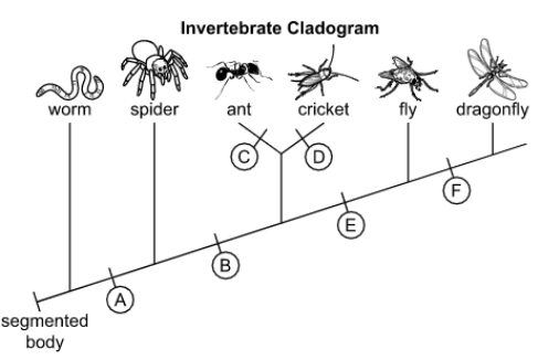The development of six legs should be placed at letter __________ on the cladogram because the body structure is present only in organisms __________ that point on the cladogram.