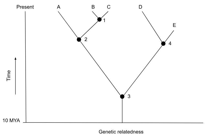 A common ancestor for species C and E could be at position number