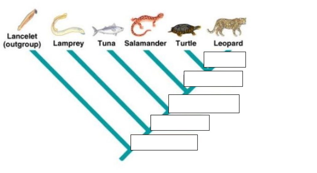 Using the information below, complete the cladogram by dragging and dropping the derived characters to their correct locations.