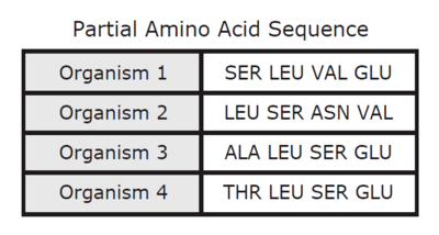 Amino acids sequences show relatedness between species. This chart represents amino acids that are coded from different combinations of mRNA codons.