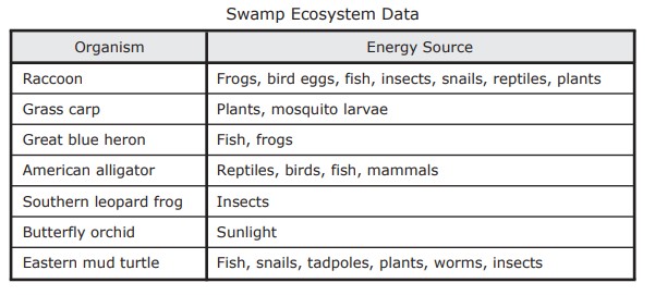 The table lists some organisms found in a swamp ecosystem and their sources of energy.