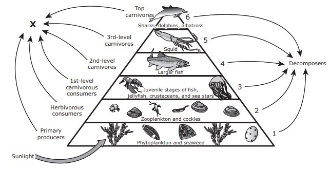 What is lost to the environment at each of the trophic levels of this ecosystem?