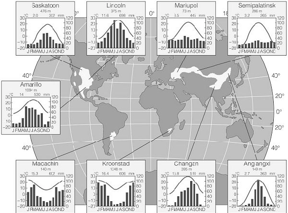 Next is a grassland of North America. There's little rain in the winter and then a fair amount in the _______ . From the shape of the temperature graph, you can see that they have four seasons. They have cold winters and hot summers.