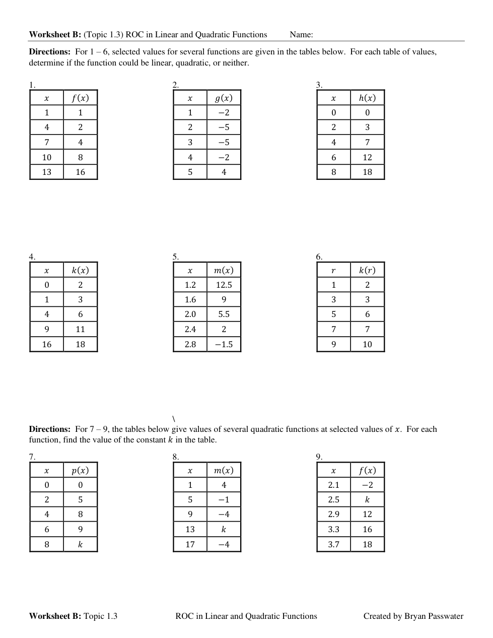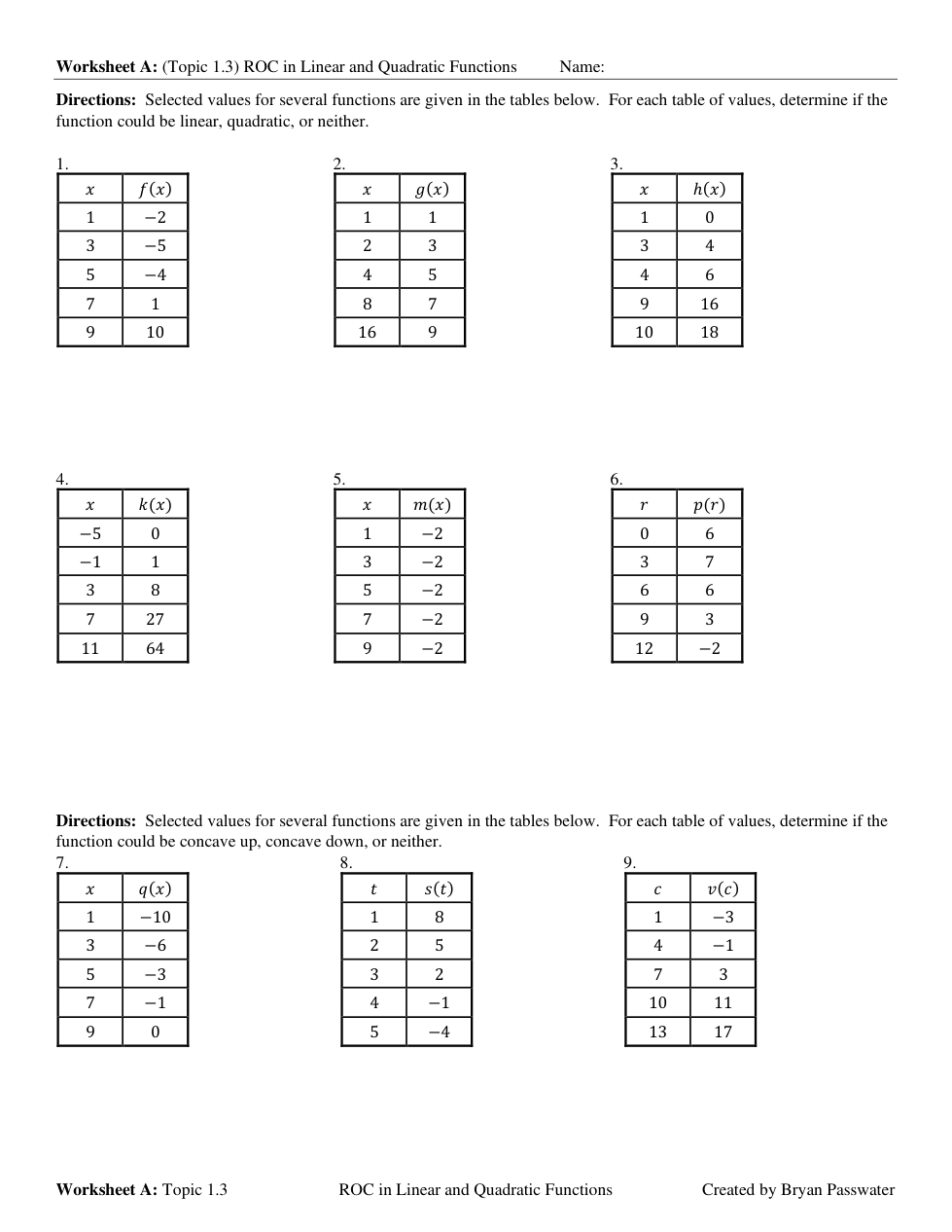 EXPLAIN VERY SPECIFICALLY how you can tell from a set of data points if a function is linear, quadratic, or neither. Use a specific example of each situation from this homework assignment in your explanation. I will grade this STRICTLY and this question is worth 10 points.