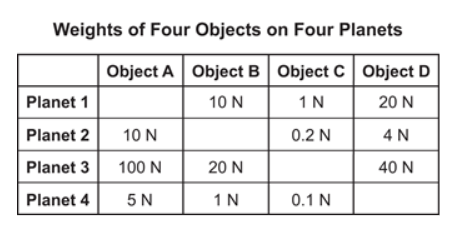 The weights of four objects with different masses have been calculated to show how much each object would weigh on four different planets.Based on the table, which object would have the largest mass and greatest weight on Earth?