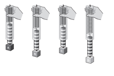 - The diagram shows four blocks suspended on identical dynamometers, a tool that is used for measuring the weights of objects. 📷