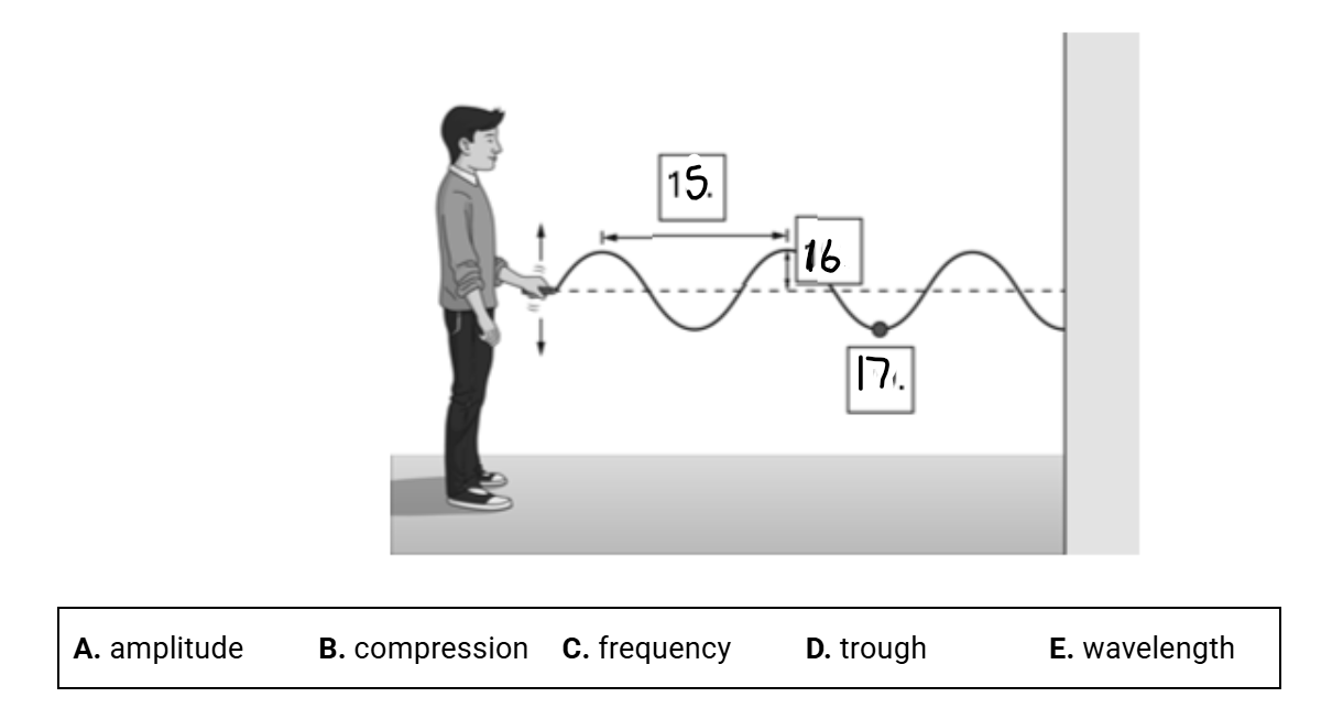 The picture shows a wave created by the movement of a rope. Select the answer matching the correct letter for numbers 15, 16, and 17 in the boxes to correctly label the parts of the wave. Some letters may be used more than once or not at all.