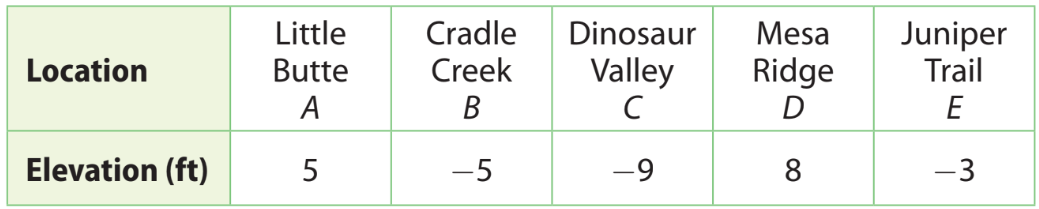 The table shows the elevations of several locations in a state park. Graph the locations on the number line according to their elevations.