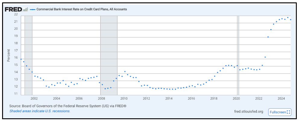 Between 2000 and 2024, what was the approximate difference between the highest average credit card interest rate and the lowest?_______ %