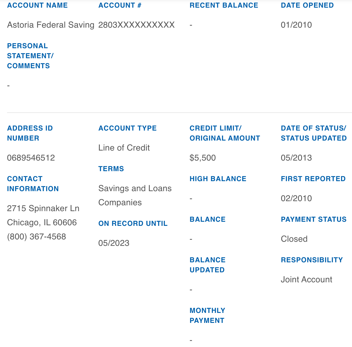 How many months did Lillie make on-time payments for her line of credit at Astoria Federal Savings?