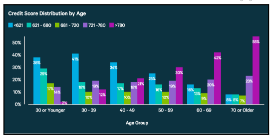 Use the graph to develop an argument that people from all age groups have room for improvement when it comes to credit management.