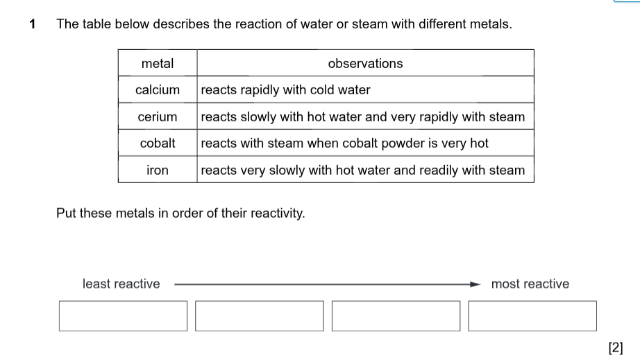 Note: metals above hydrogen in the reactivity series will not react with acids.Note: The oxides of metals below carbon in the reactivity series will be displaced by carbon.