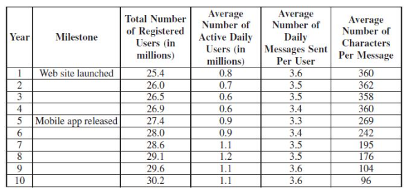 A social media site allows users to send messages to each other. A group of researchers gathered user data for the first 10 years of the site’s existence. Some of the data are summarized in the table below, along with some of the company milestones.