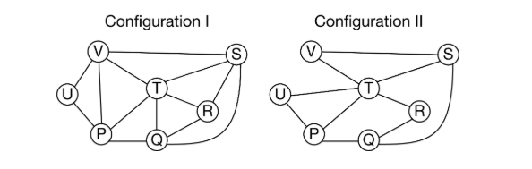 The figure below shows two possible network configurations for devices P through V. A line between two devices indicates a connection. Devices can communicate only through the connections shown.